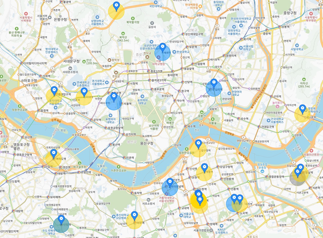 지도에는 위치와 함께 근처 반경을 보여주는 원이 나타나고 원 색깔의 의미는 다음과 같습니다.
