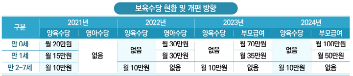 - 아동수당: 10만 원(만 0-7세, 재산무관)