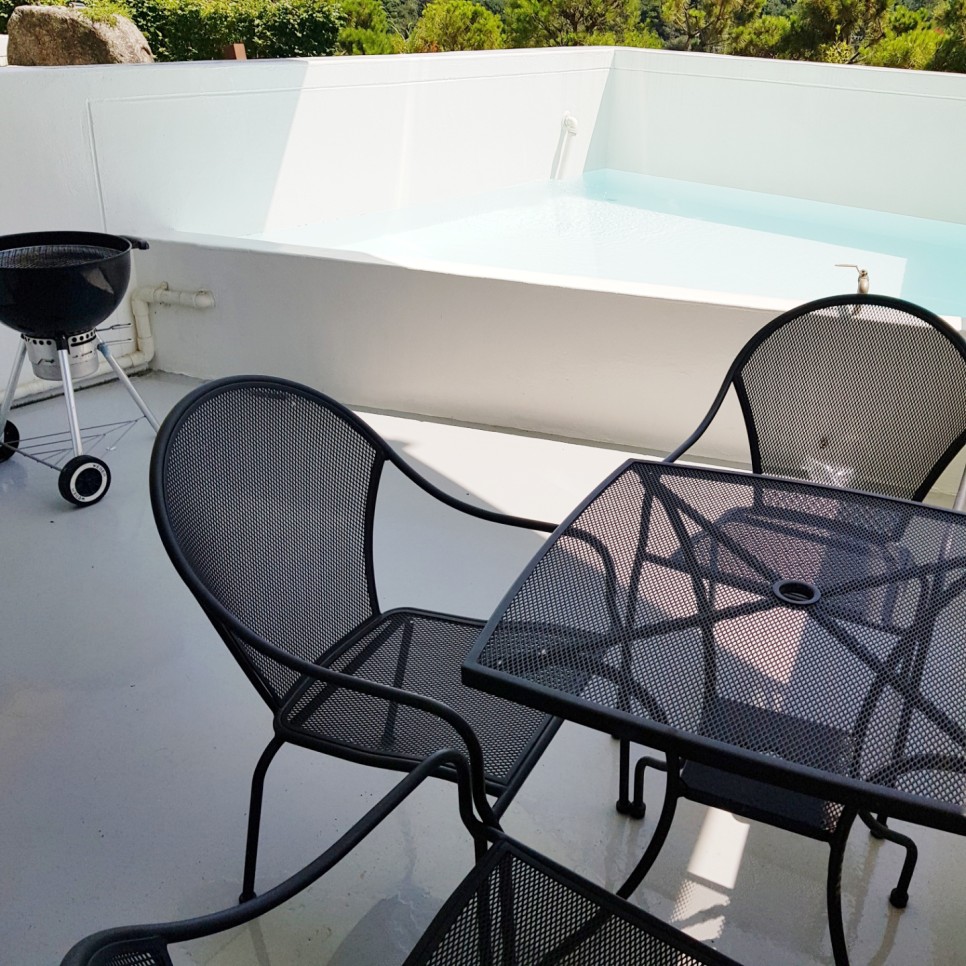 거실 창문을 열고 야외 테라스로 나가면 고기를 구워 먹을 수 있는 야외 테이블과 그릴 그리고 그 앞에 아주 작은 풀장이 있습니다.
