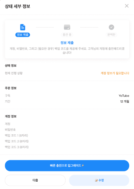 모든 것을 입력하면 충전이 완료될 때까지 기다려야 하는데요. 저 같은 경우 2-3일 걸렸습니다. 이 시간을 기다리지 못하시는 분들은 '추가비용'을 지불하시고 '번개 충전'을 이용하시면 됩니다. 모든 것이 완료되면 다음과 같이 확인하실 수 있습니다. 그리고 유튜브 프리미엄을 자유롭게 사용하시면 됩니다.
