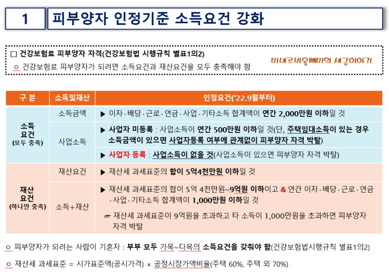 최근 탈락요건들이 변경이 되어 자칫 피부양자 자격이 박탈될 수 있습니다.