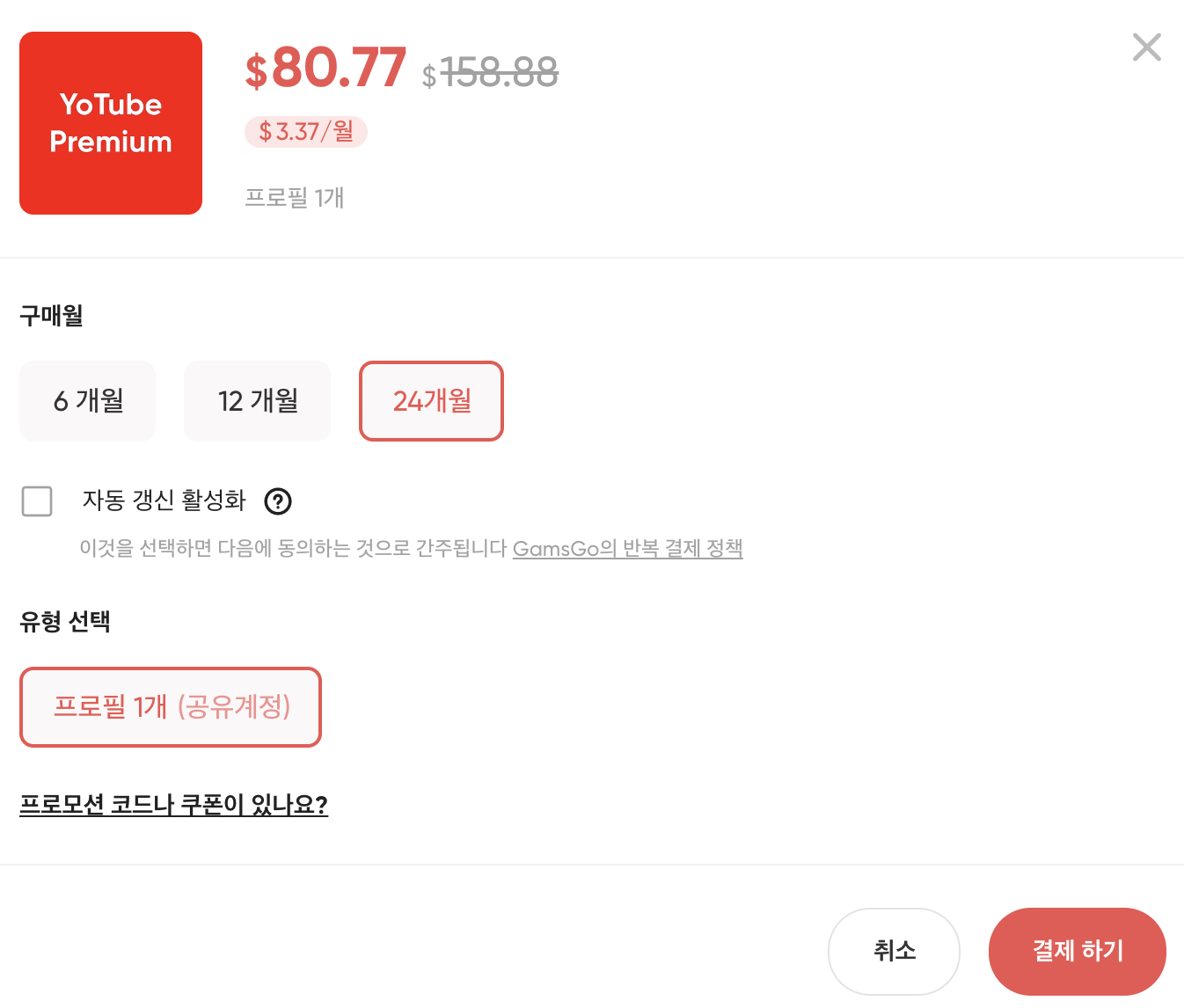 ※ 저렴하기 때문에 1개월씩 결제하는 것은 따로 없습니다. 참고하세요.