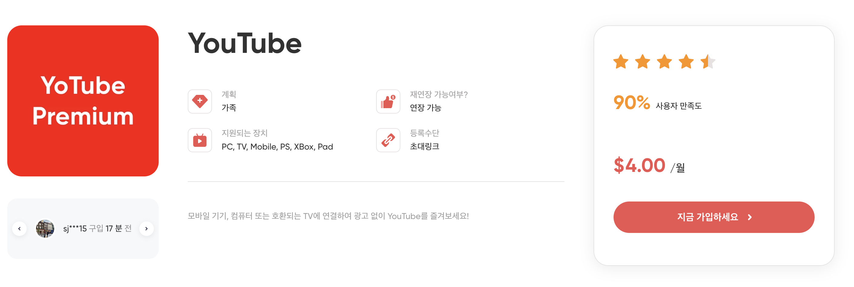 예를 들어 유튜브 프리미엄을 구독하고 싶다면 '지금 구입' 버튼을 클립 합니다.