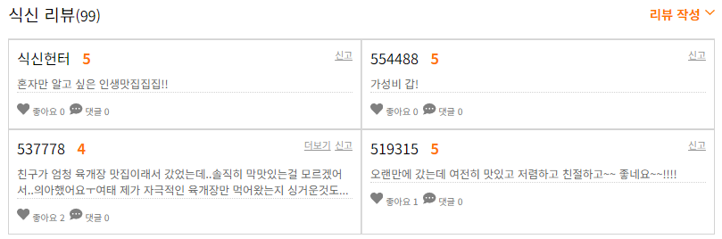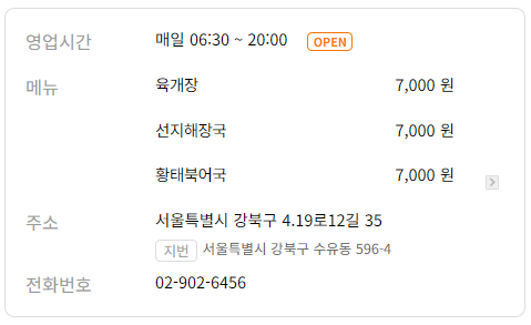 - 대표메뉴: 육개장 7,000원 수육 19,000원 (들깨)곱창육개장 10,000원