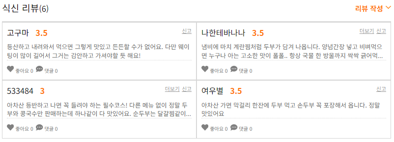 - 대표메뉴: 두부보쌈 35,000원 얼큰 순두부 7,000원 맑은 순두부 7,000원
