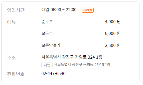 - 대표메뉴: 순두부 4,000원 모두부 6,000원 콩국수(계절) 6,000원