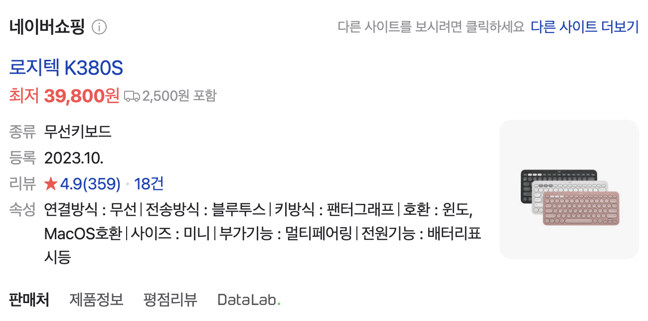 - 반면에 K380S는 타자감이 너무 좋았습니다. (개인적으로 95점!) 적절한 정도의 키보드 소리와 키보드를 눌렀을 때 기분 좋은 타자감이 개인적으로는 너무 마음에 들었습니다. 말로 표현할 순 없지만 맥북과 비슷한 느낌이었습니다. (저는 노트북을 맥북을 사용합니다.)