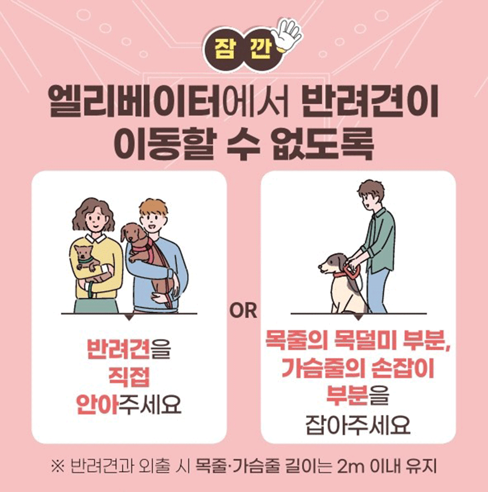 | 아파트, 다가구 주택 등 공동주택 엘리베이터, 복도, 계단 등에서 목줄과 가슴줄을 착용하더라도 목줄의 목덜미 부분이나 가슴줄의 손잡이 부분을 직접 잡거나 가슴에 안아야 하는 의무 | 오피스텔, 기숙사 등 준주택에 해당되는 건물 추가 |