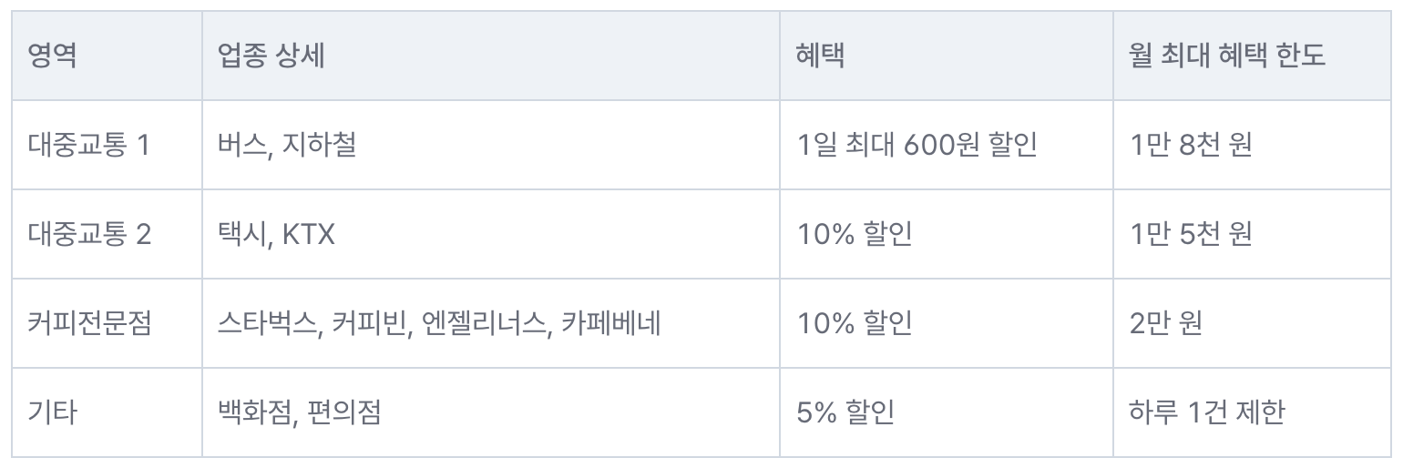 - 매일 할인영역: 점심, 배달앱, 대중교통 업종