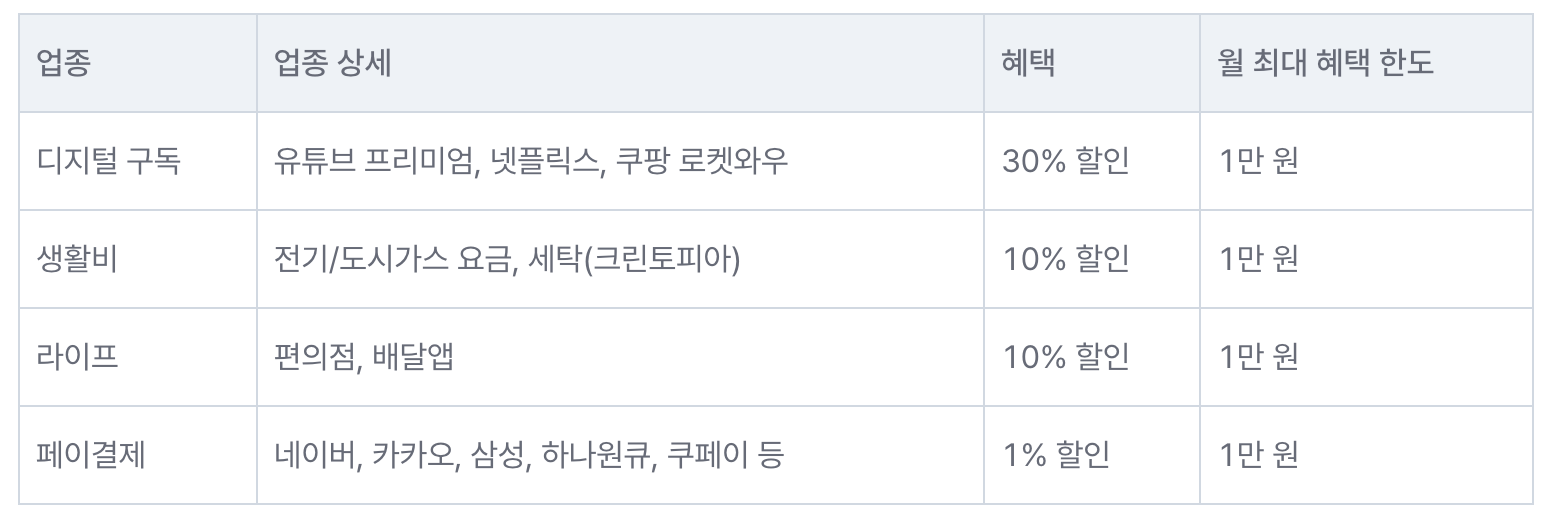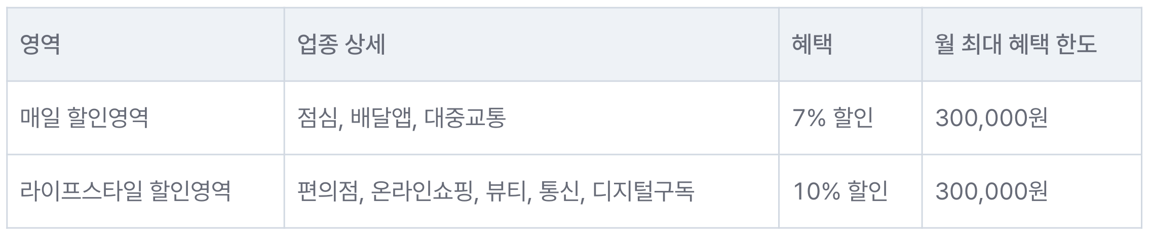 - 매일 할인영역: 점심, 배달앱, 대중교통 업종