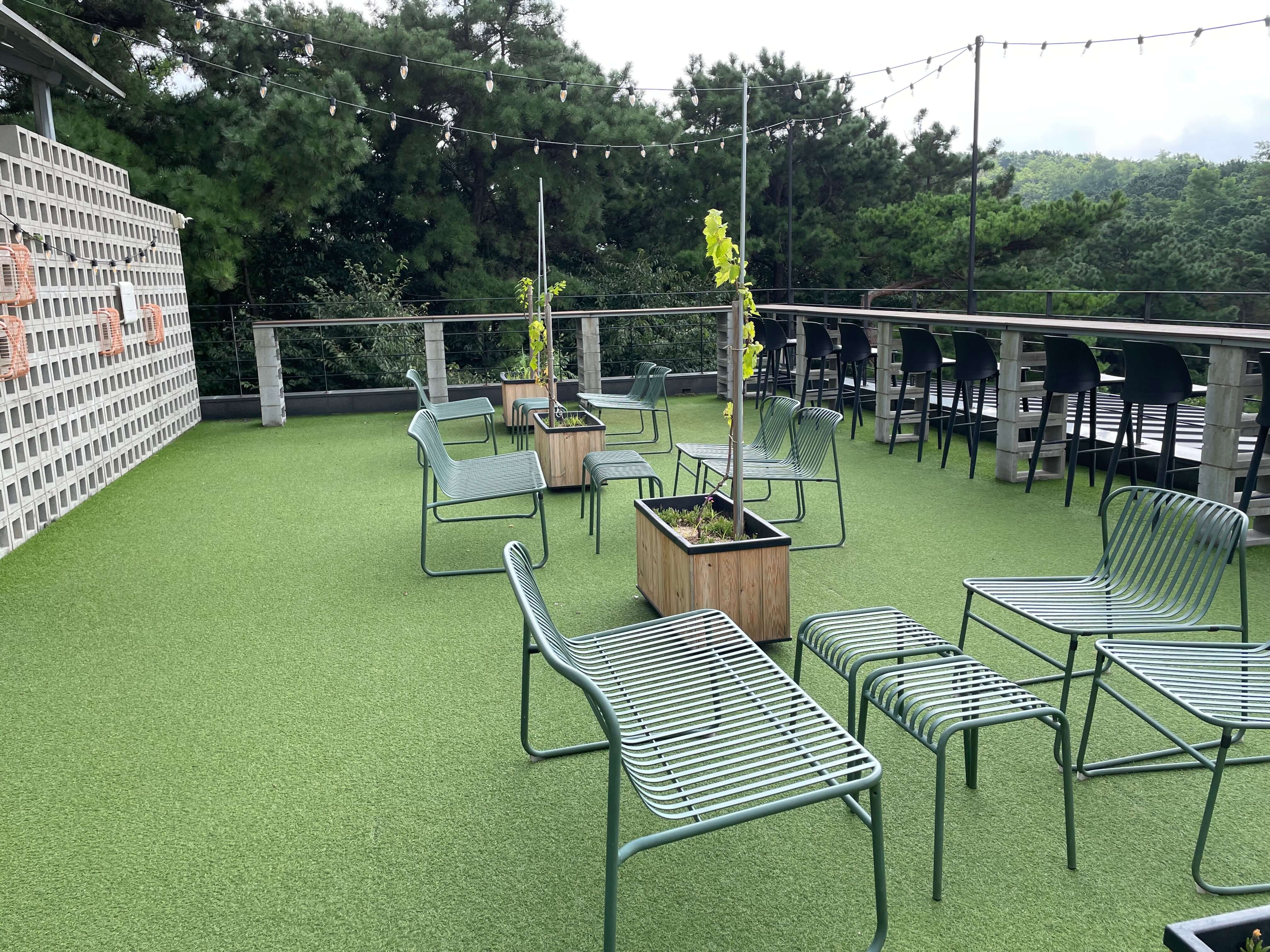 작은 공간에는 2-3개 테이블이 있는데 3층으로 올라가는 계단이 편백나무로 되어있어서 편백향이 은은하게 나서 또 다른 분위기를 만드는 것 같습니다. 그렇게 3층으로 올라가면 루프탑이 나오게 되고 야외를 바라보며 커피와 차 그리고 다과를 즐기실 수 있습니다.