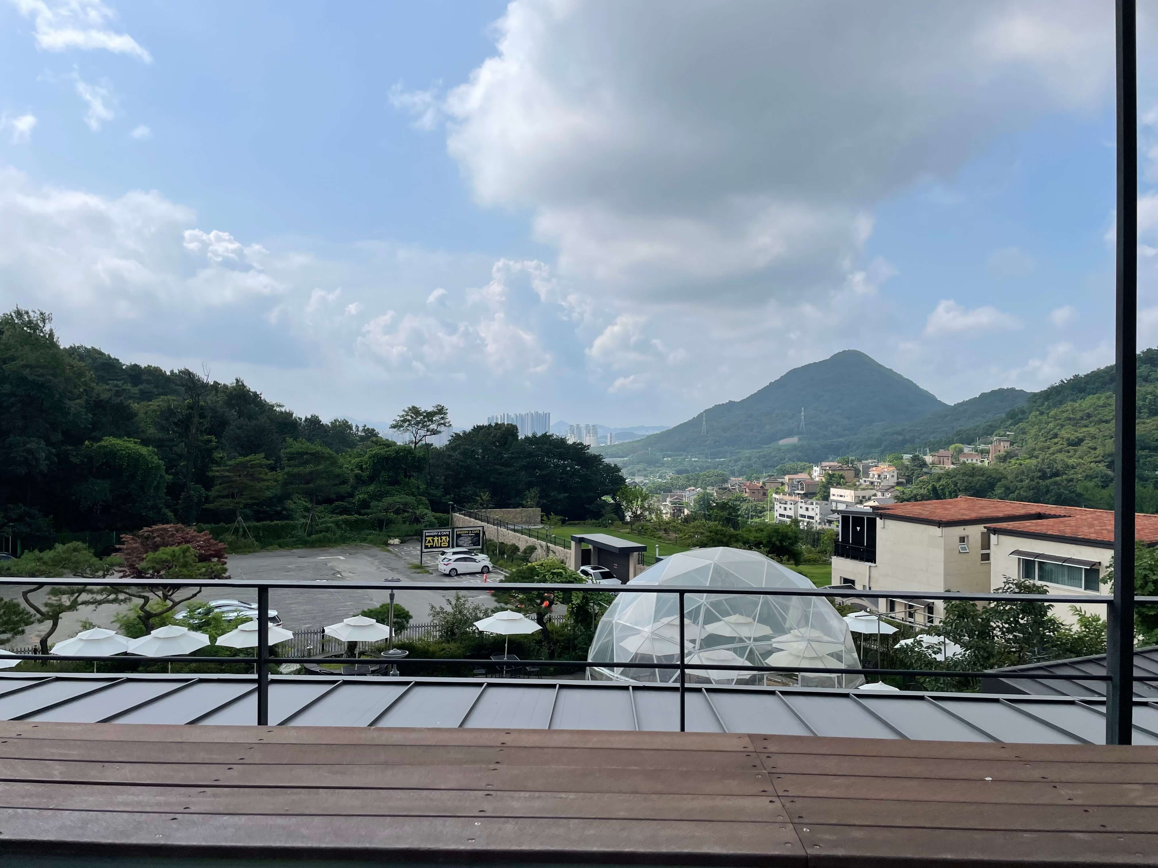 작은 공간에는 2-3개 테이블이 있는데 3층으로 올라가는 계단이 편백나무로 되어있어서 편백향이 은은하게 나서 또 다른 분위기를 만드는 것 같습니다. 그렇게 3층으로 올라가면 루프탑이 나오게 되고 야외를 바라보며 커피와 차 그리고 다과를 즐기실 수 있습니다.