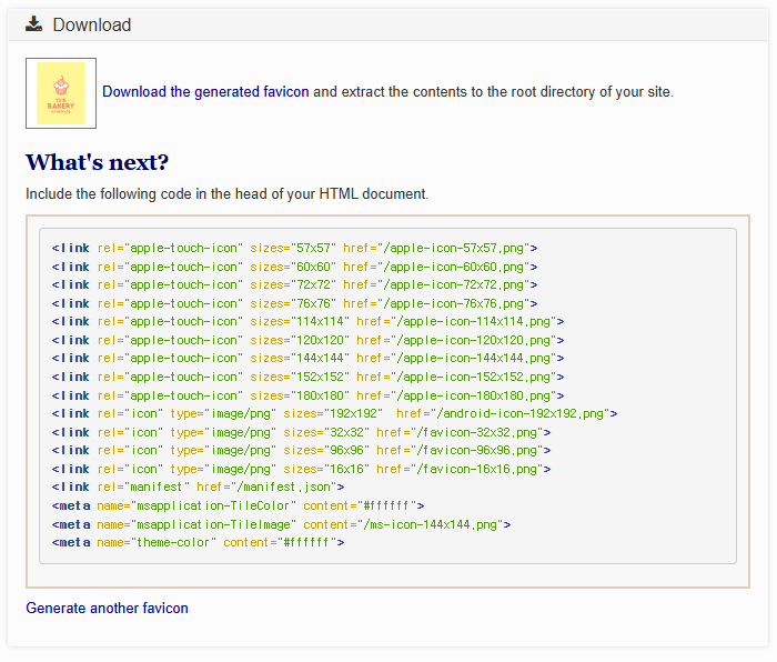 그러면 알아서 파비콘을 만들어 줍니다. 모든 작업이 완료되면 'Download the generated favicon' 버튼을 눌러 압축파일을 다운받아 줍니다.
