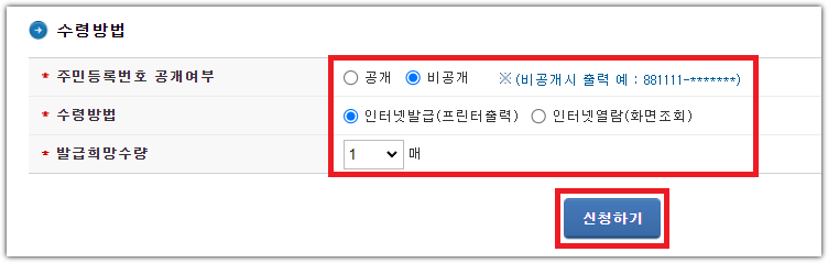 주민등록번호 공개를 선택하고 수령방법 및 발급희망수량을 선택합니다.