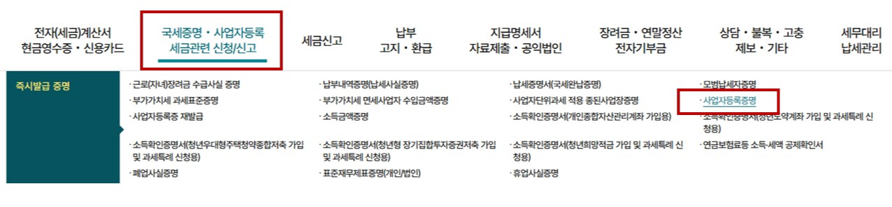 2. 민원증명 메뉴에서 '사업자등록증명' 클릭
