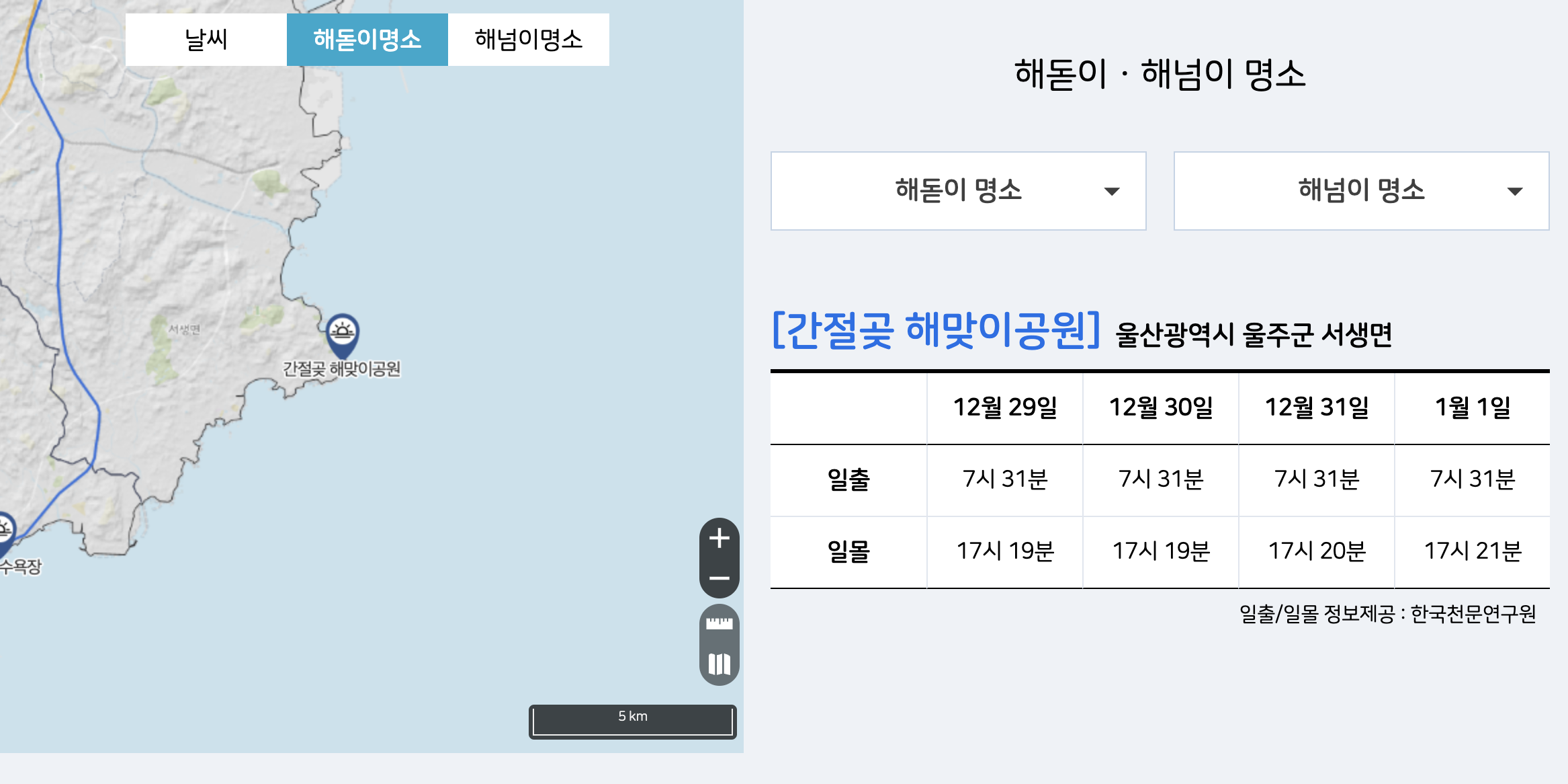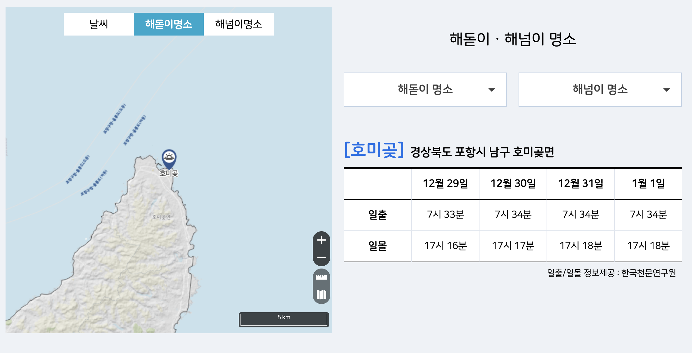 여기를 들어가시면 장소별 '일출시간' '날씨'를 확인하실 수 있습니다.