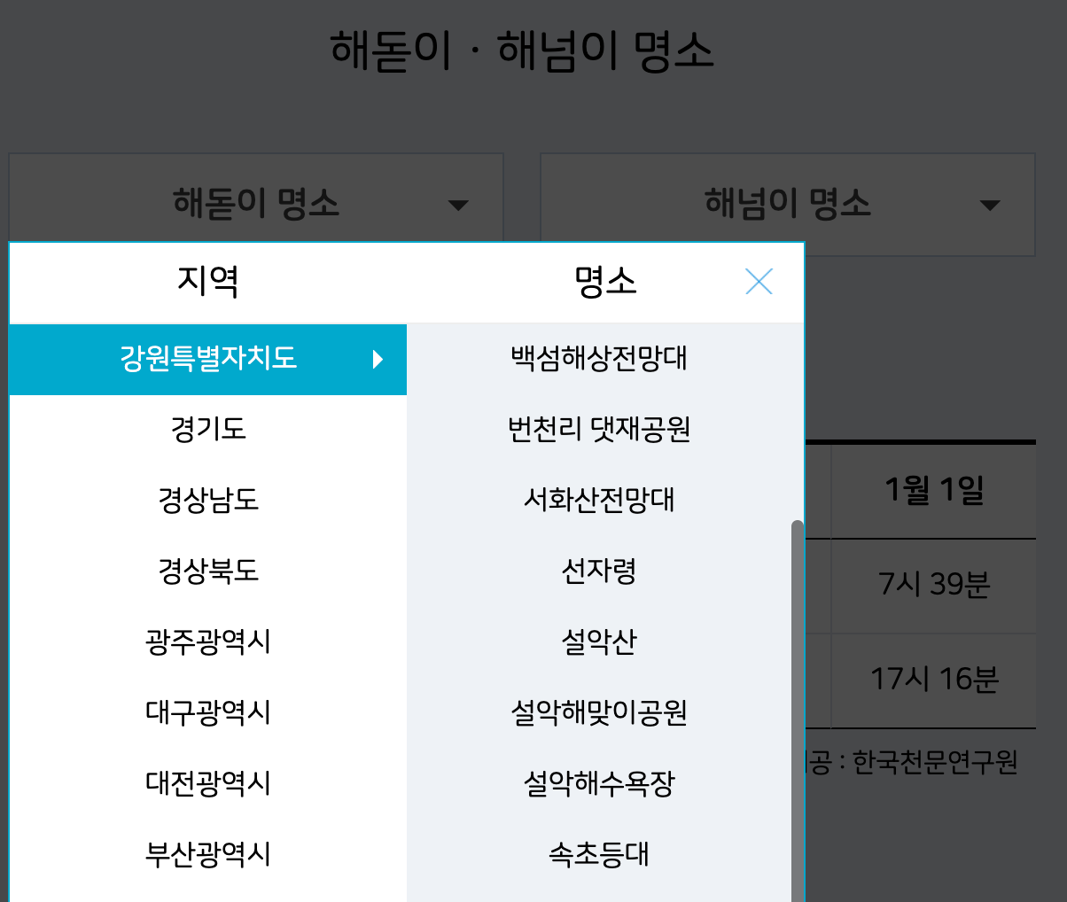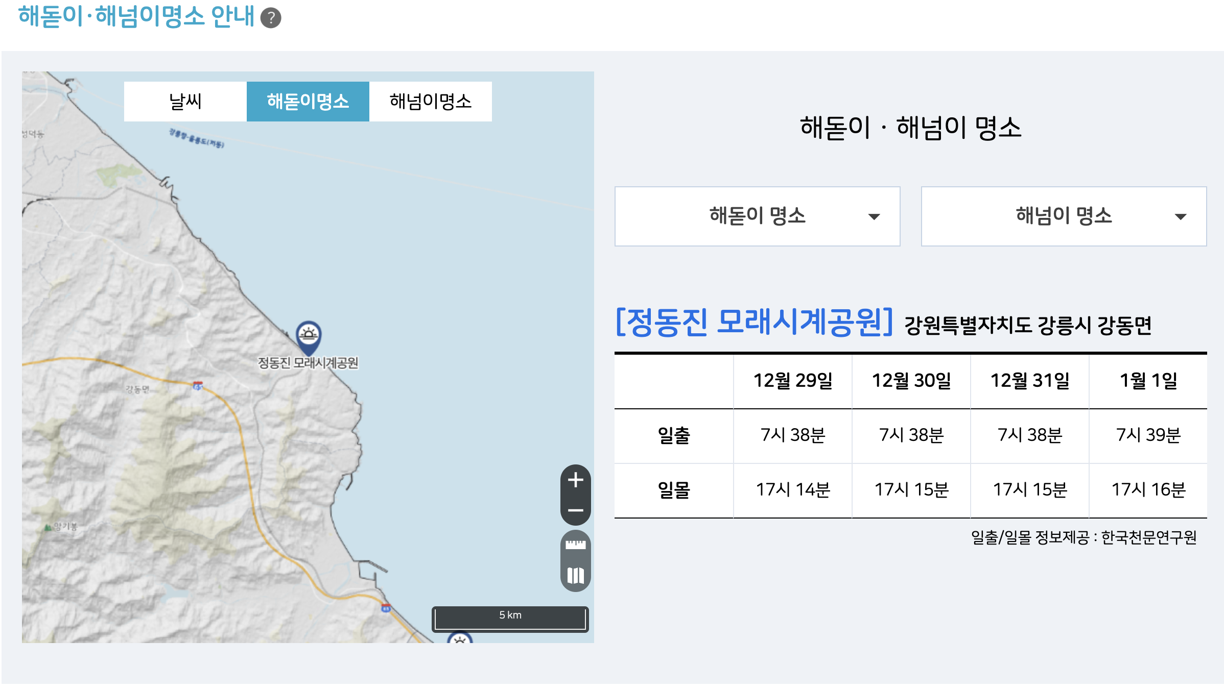 기상청 날씨누리에 들어가 보시면 원하는 지역의 일출명소를 확인할 수 있습니다.
