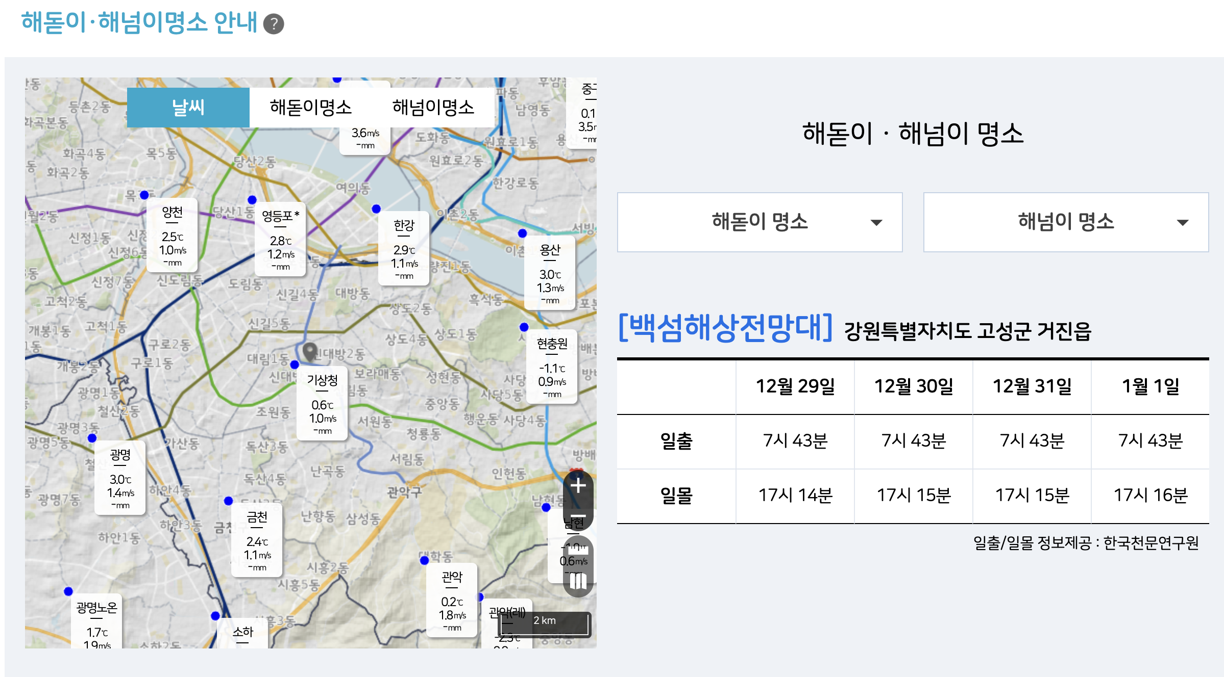 지도를 사용해서 원하는 위치를 찾을 수 있고 아래와 같이 '해돋이 명소'를 클릭하면 기상청에서 추천하는 '해돋이 명소'를 확인할 수 있습니다. 그리고 명소에 따른 일출시간을 당연히 확인할 수 있고요.