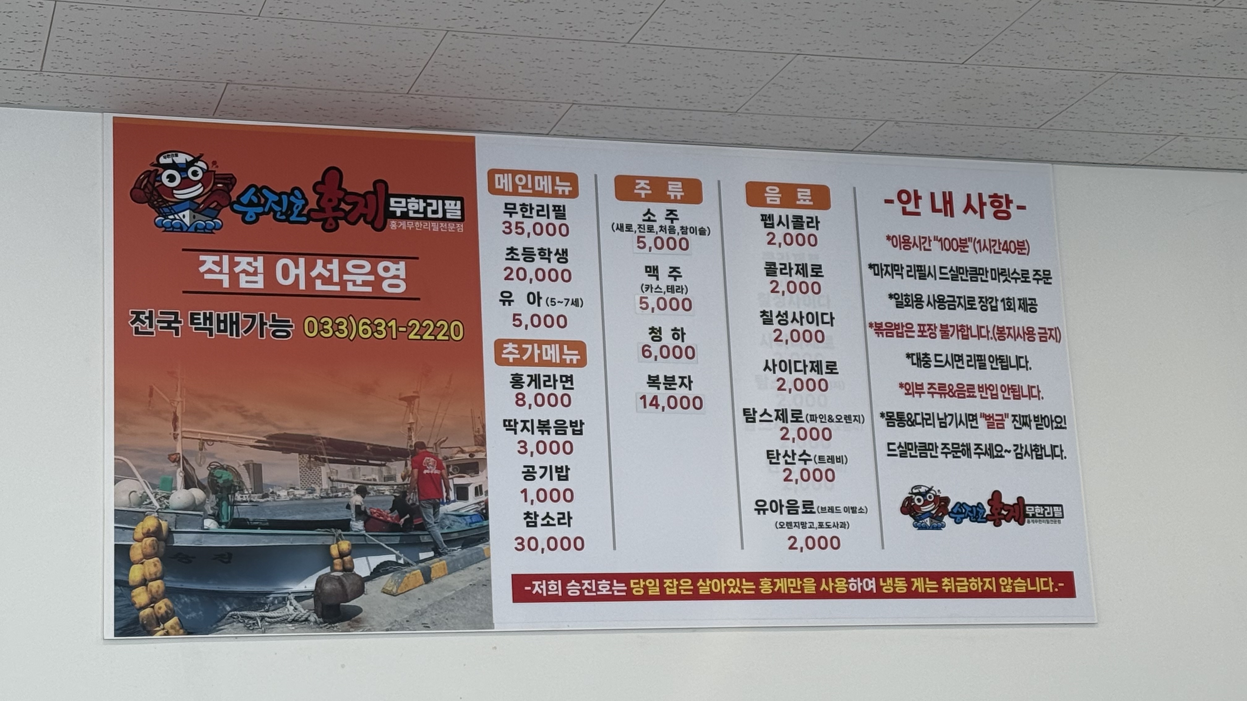 무한리필 기준으로 보았을 때 성인은 35,000원, 초등학생은 20,000원, 미취학 어린이는 5,000원 입니다. 가격을 꼭 확인하시구요. 왜 가격을 확인하라고 하냐면 뒷 부분에 홍게를 포장했을 때 가격 때문입니다. 포장가격은 6만원 12만원 이렇게 두 가지가 있는데 6만원의 경우 6-7마리 12만원의 경우 12, 15마리 입니다. 그런데 저희가 갔을 때 먹어본 결과 한 사람당 적어도 5-6마리 이상 먹는다는 것입니다. 그러니 포장하지 않고 집적가서 먹는 것이 훨씬 이득입니다. 꼭 방문해서 식사하시기를 추천드립니다.