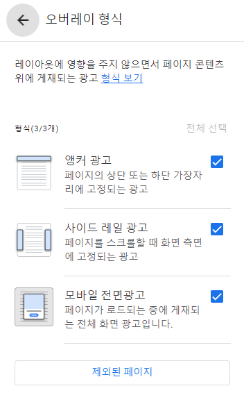 광고 설정을 보면 여러 가지가 있는데 가장 위에 있는 '오버레이 형식'을 선택합니다.