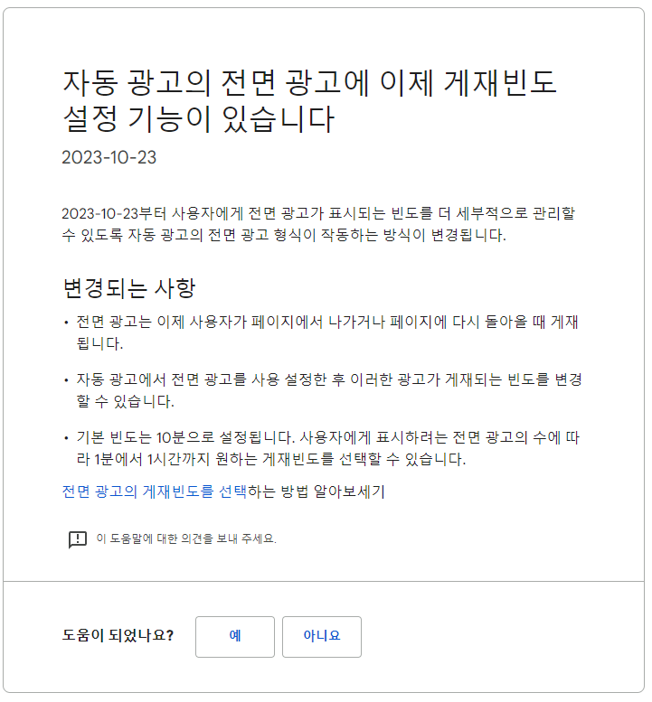 그런데 최근 구글 애드센스에서 새로운 공지가 하나 나왔는데 바로 '자동광고의 전면 광고에 이제 게재빈도 설정 기능이 있습니다.'라는 공지였습니다. 쉽게 말하면 이전에는 전면 광고가 뜨는 시간을 조절할 수 없었는데 이제 가능하게 되었다는 말입니다. 그래서 이번에는 '전면광고 게제빈도 설정'에 대해서 알아보도록 하겠습니다.