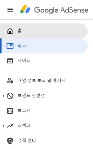 구글 애드센스 홈페이지에서 왼쪽 상단에 있는 메뉴바에서 '광고'를 선택합니다.