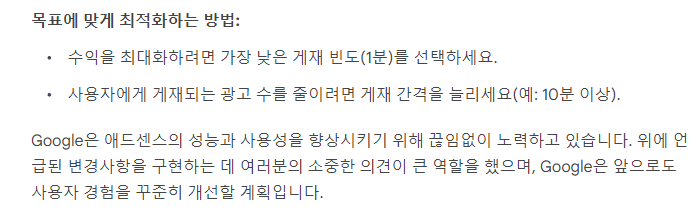 - 사용자에게 게재되는 광고 수를 줄이려면 게재 간격을 늘림(예, 10분 이상)