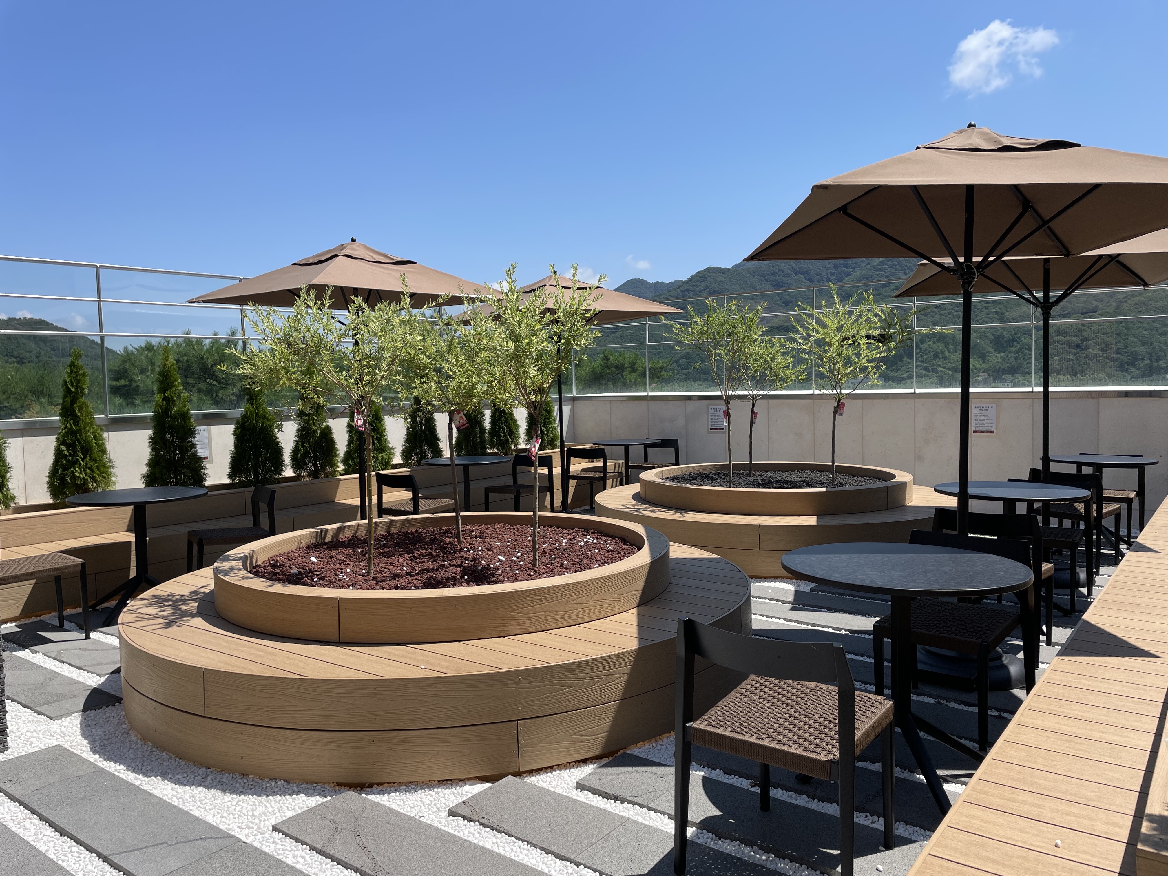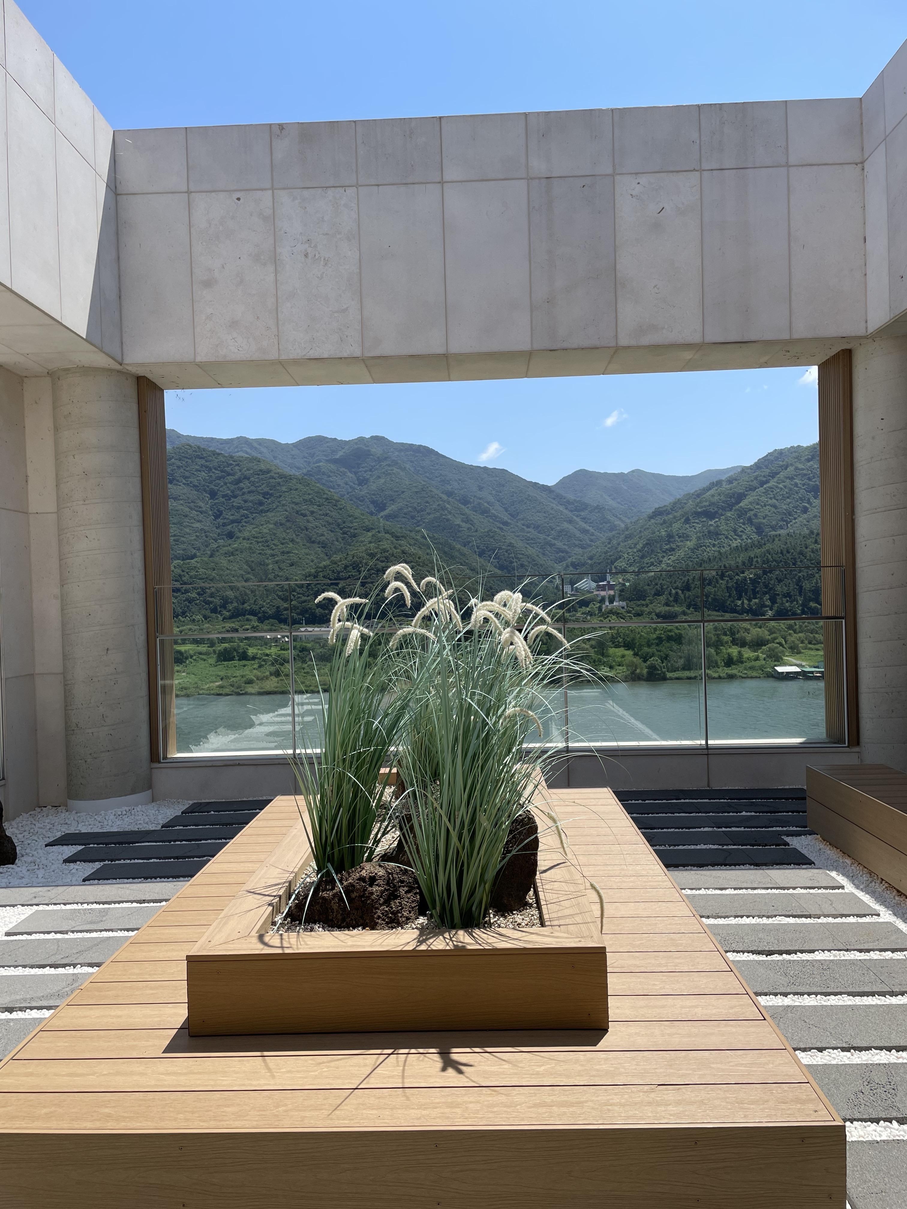 2층에서 3층으로 올라가는 계단을 지나면 이렇게 아름답게 꾸며놓은 루프탑 정원을 볼 수 있습니다. 그리고 왼쪽으로 가면 바깥 경치를 그대로 느끼면서 여유를 느낄 수 있는 공간도 마련되어 있습니다.