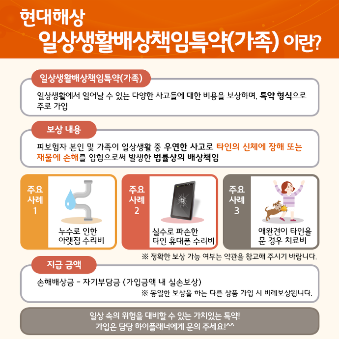 남에게 피해를 끼쳐서 뭔가 물어줘야 하는 상황은 거의 대부분 보상 가능(누수로 아랫집 피해, 타인 휴대폰 수리비, 강아지가 다른 사람을 물었을 때 우리 아이가 다른 사람의 차나 TV 등을 파손했을 때 등)