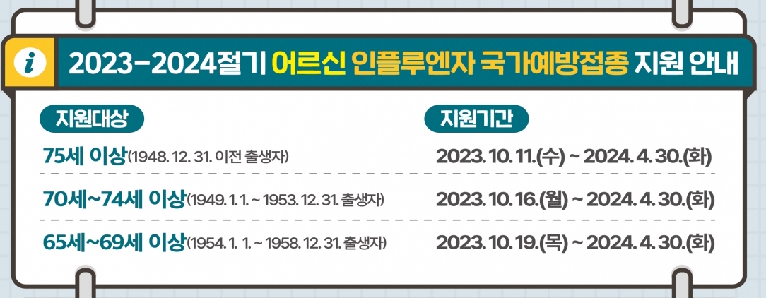 | 65세 - 69세 이상 (1954.1.1 - 1958.12.31) | 2023.10.19(목) - 2024.4.30(화) |