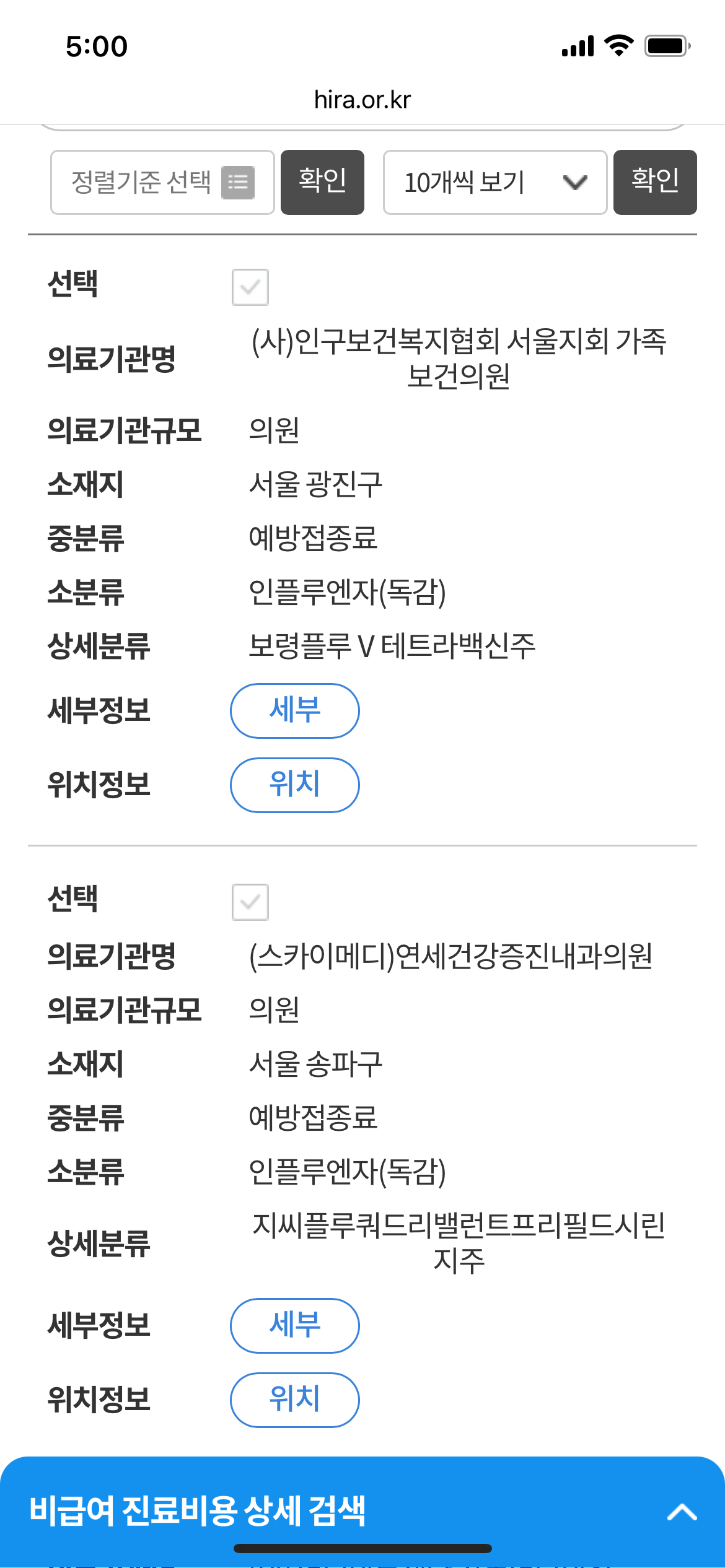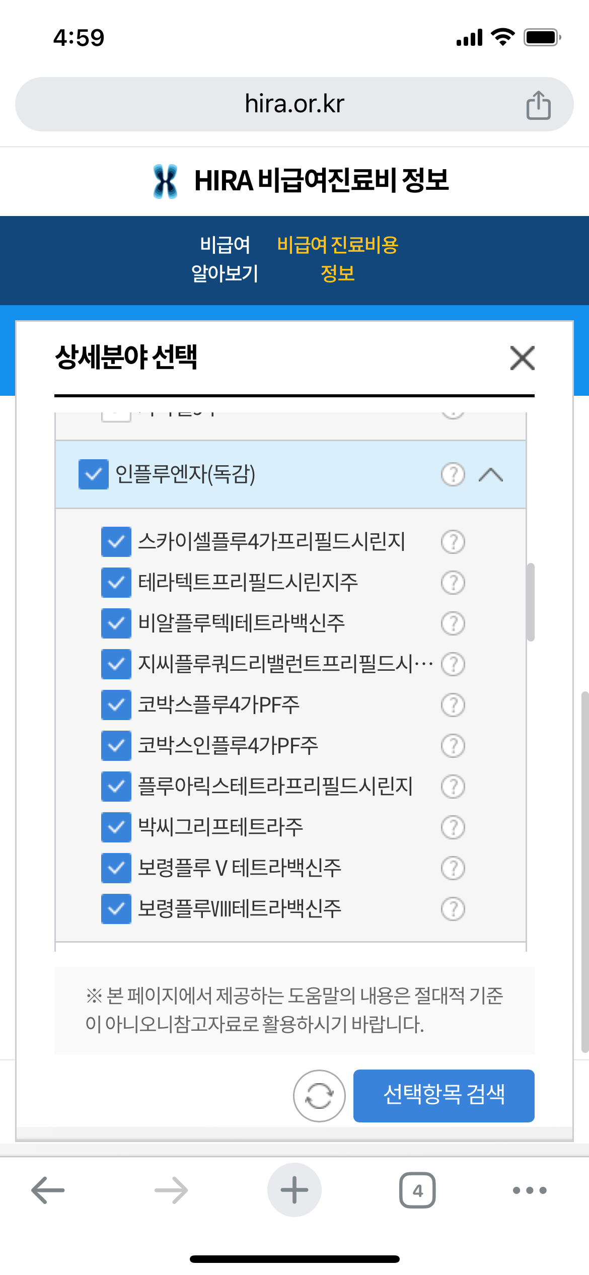 6. 인플루엔자(독감) 선택 후 선택항목 검색