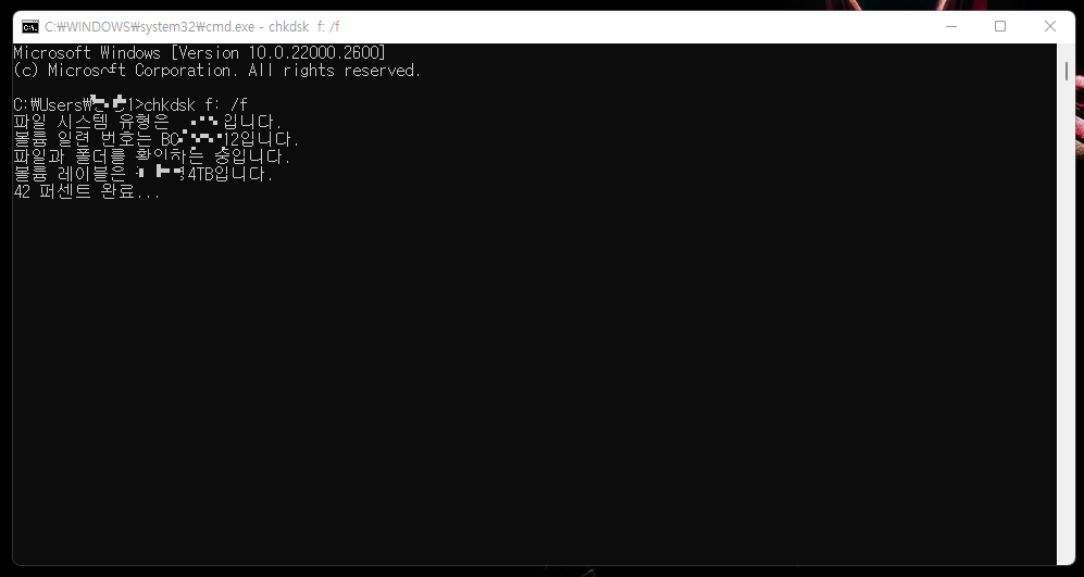 예) 외장하드가 D 드라이브로 될 경우 d: / f 라고 입력하시면 됩니다. (/f 는 꼭 붙여주세요)