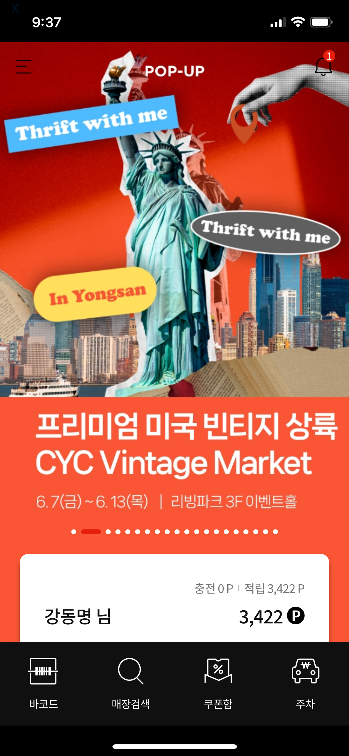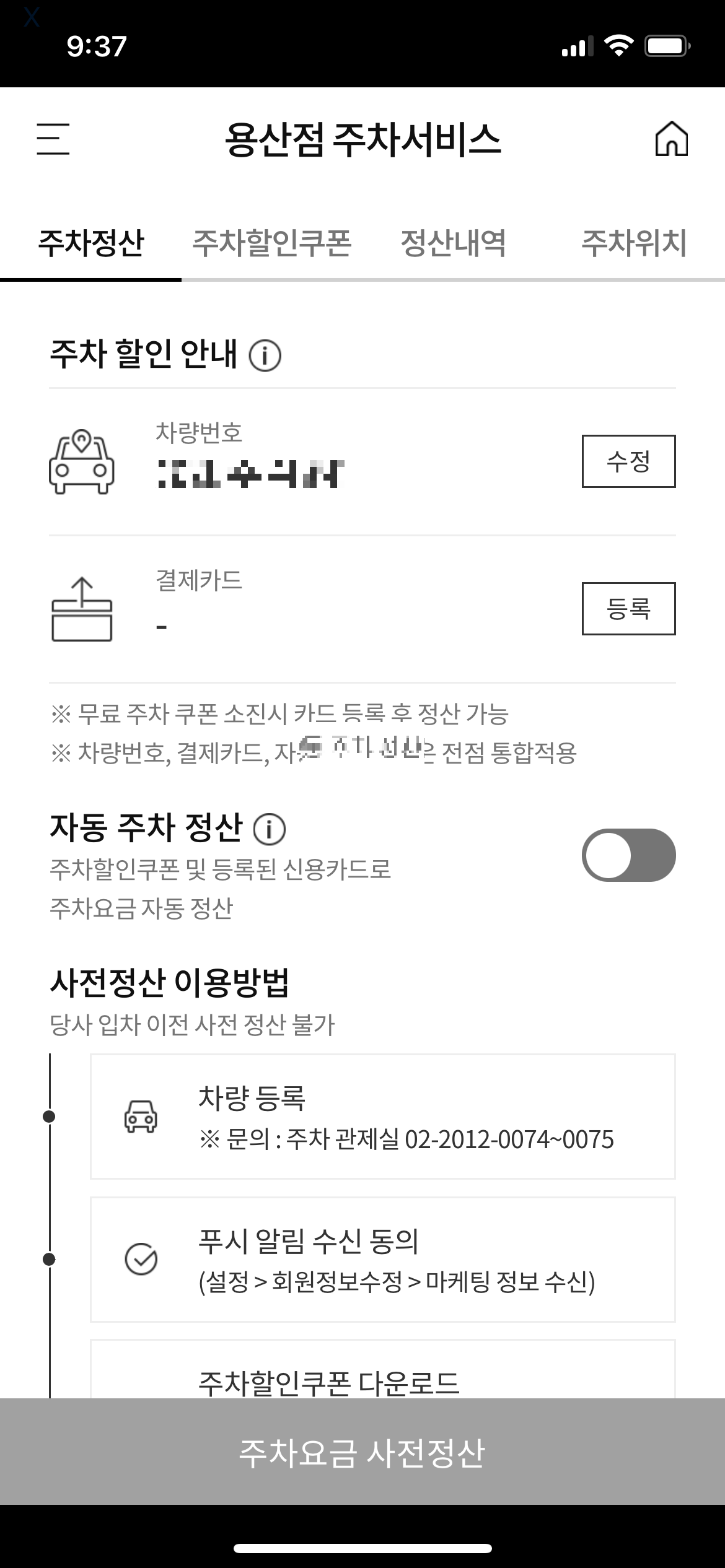 - 아이파크몰 앱을 실행하면 우측 하단에 주차 탭 클릭!
