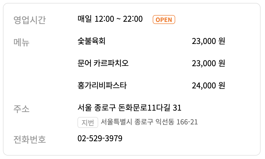 - 영업시간: 매일 12:00-22:00 (B/T 15:00-16:00)