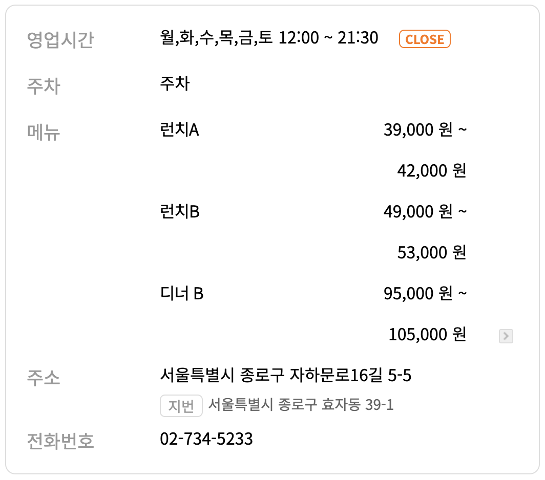 - 대표메뉴: 런치 39,000~53,000원, 디너 75,000원~99,000원