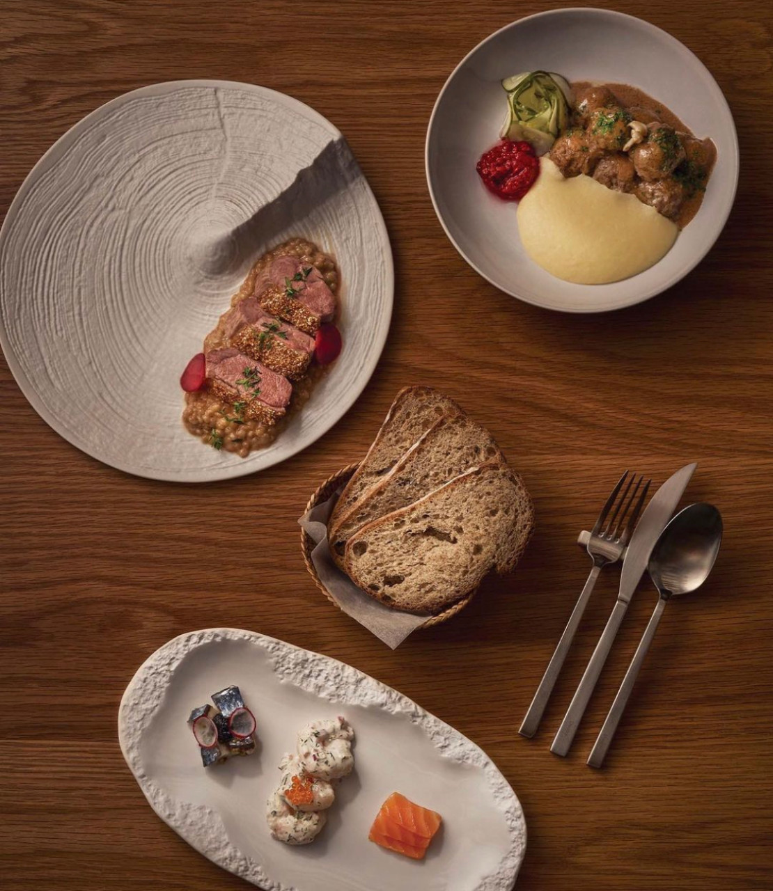 스웨덴어로 호수 위로 비친 달빛을 의미하는 ‘만가타’. 한옥의 서까래를 그대로 살린 매장 속, 달과 호수를 형상화한 인테리어가 어우러지며 감성적인 분위기를 자아냅니다. 소기름과 소금으로 간을 하여 구운 식전빵은 별다른 소스 없이 먹어도 될 만큼 적당한 감칠맛이 맴돕니다. 대표 메뉴 ‘köttbullar’는 소고기와 돼지고기를 잘게 다져 동그랗게 빚은 미트볼에 라즈베리 잼, 페르시안 오이피클, 훈연 매시드 포테이토를 곁들여 제공합니다. 부드러운 식감과 담백한 맛을 자랑하는 미트볼에 매시드 포테이토의 고소함과 라즈베리의 산뜻함이 어우러지며 맛의 풍성함을 더합니다.