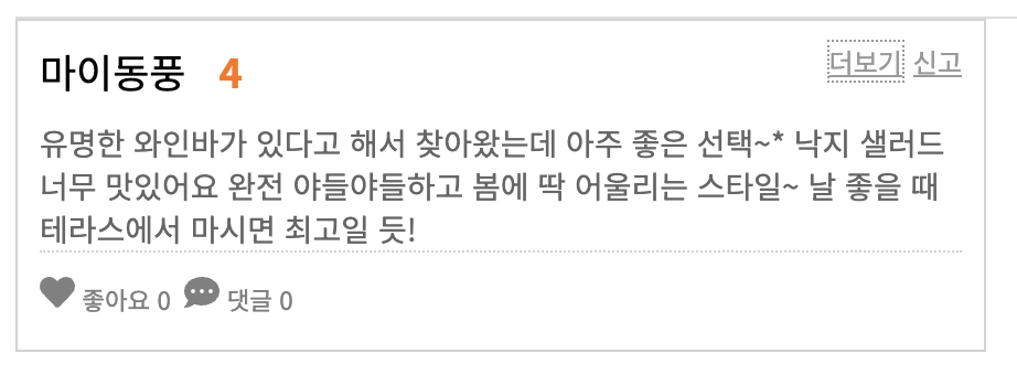 - 영업시간: 수-목 17:00-23:00 금 17:00-24:00 토 15:00 -24:00 일 15:00-23:00 매주 월·화 휴무
