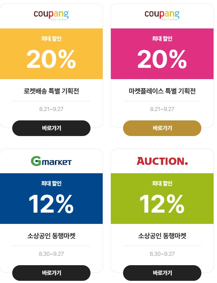 - 쿠팡, 지마켓, 인터파크, 티몬, 11번가 등 국내 주요 온라인 상점가(쇼핑몰)와 정부, 지자체가 운영하는 공공상점가(쇼핑몰)에서는 추석 명절을 맞이해 '식품, 지역 특산품', '생활용품', '패션뷰티', '디지털가전' 등을 최대 50%까지 할인