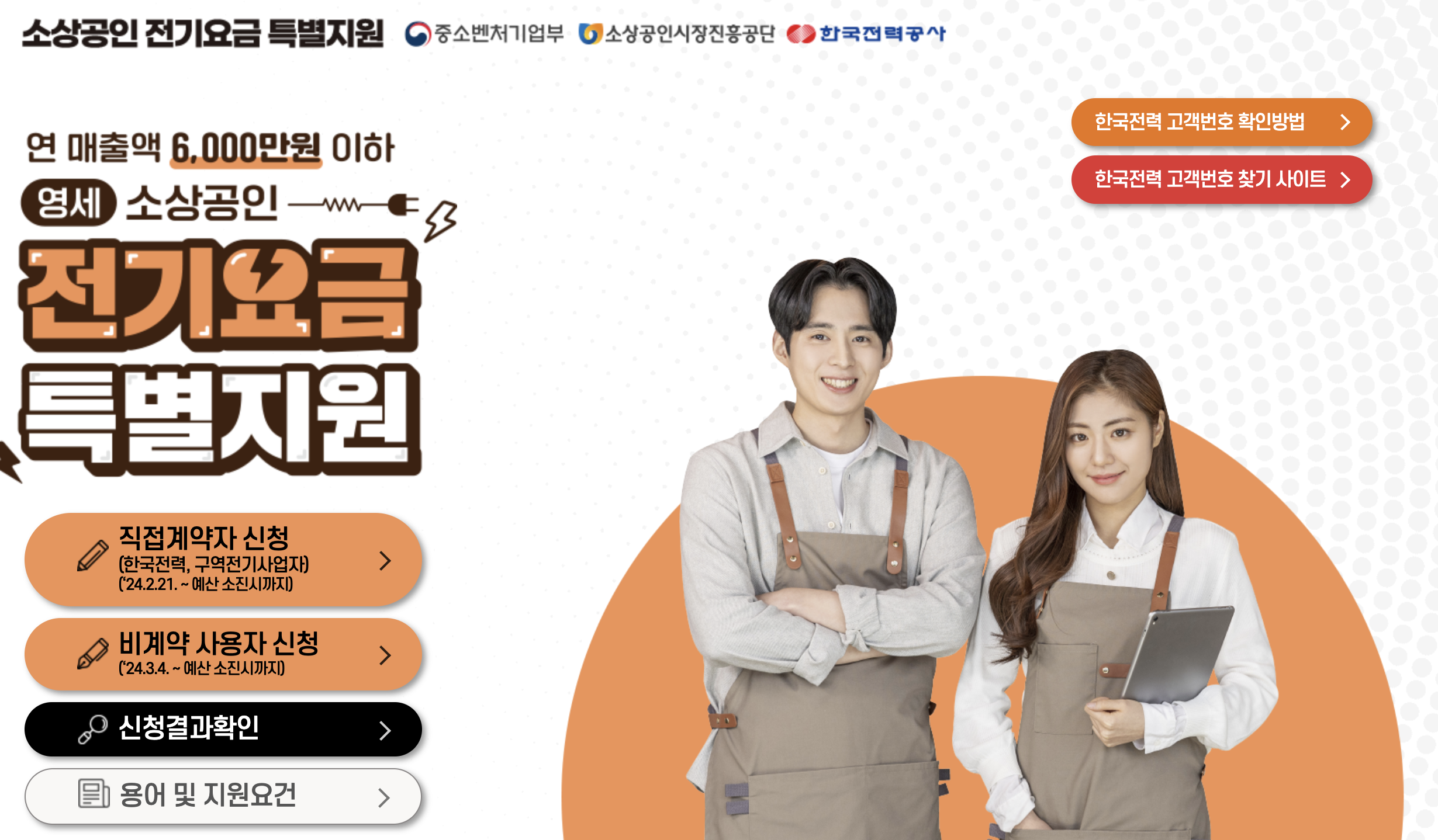 * 지원기준, 신청기간, 방법 등 세부 확인사항은 공고문을 참고하시기 바랍니다. - 2. 한국전력(이하 구역전기사업자 포함)과 본인명의로 계약을 맺고 있지 않는 사업자여야 합니다.