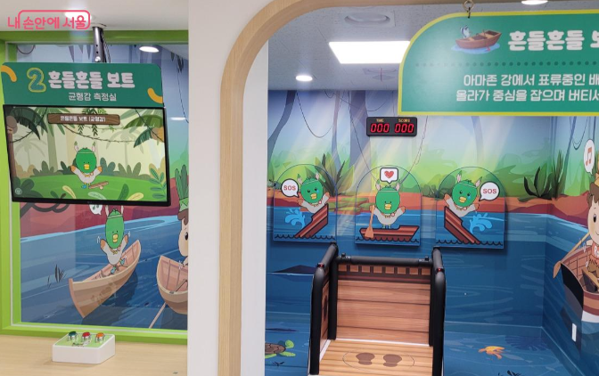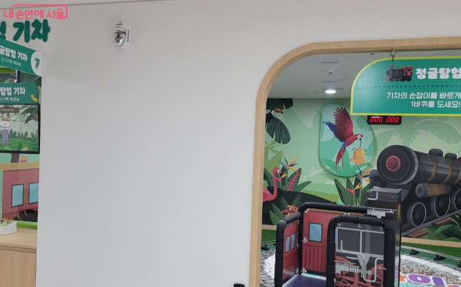 다음으로 일곱 번째 측정실은 근지구력을 측정할 수 있는 '정글탐험 기차'로 기차의 손잡이를 빠르게 움직여 레일 1바퀴를 돌면 측정이 가능합니다. 마지막 여덟 번째 측정실은 협응력을 측정할 수 있는 '싱글벙글 원숭이'인데 이곳에서는 주어진 시간 동안 무작위로 불이 들어오는 원숭이를 공을 던져 맞추면 됩니다.