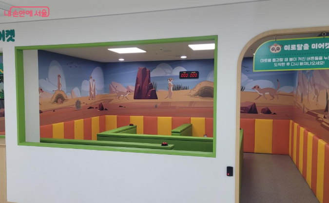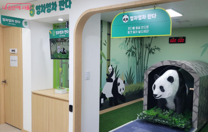 8개의 체력측정실 중 가장 귀엽다고 생각했던 곳이 바로 다섯 번째 측정실 '영차영차 판다'입니다. 이곳은 동굴 안으로 판다를 힘껏 밀어 근력을 측정하는 곳입니다. 여섯 번째 측정실은 '미로탈출 미어캣'입니다. 미로를 통과하며 불이 켜진 버튼을 누르고 도착 후 다시 빠져나오는 활동인데요. 바로 민첩성을 측정하는 활동입니다.