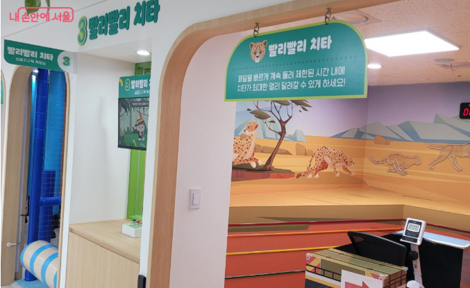 세 번째는 심폐지구력을 측정하는 '빨리빨리 치타'였는데 실내 사이클과 비슷해 보였습니다. 페달을 빨리 돌려 치타가 멀리 달려갈 수 있도록 도와주는 활동입니다. 정글아이라는 이름에 걸맞게 동물을 주제로 아이들이 놀이처럼 체력 측정을 자연스럽게 할 수 있도록 마련되어 있습니다. 네 번째는 '구불구불 수달'이었다. 이곳에서는 아이들이 장애물을 피해 방을 빨리 탈출해야 하는 활동인데요. 아이들이 하는 활동이라 간단할 것 같지만 내부를 보니 꽤 복잡해 아이들이 방을 빠져나오는 데 신체 다양한 부분의 유연성을 필요로 할 것 같아 보였습니다.