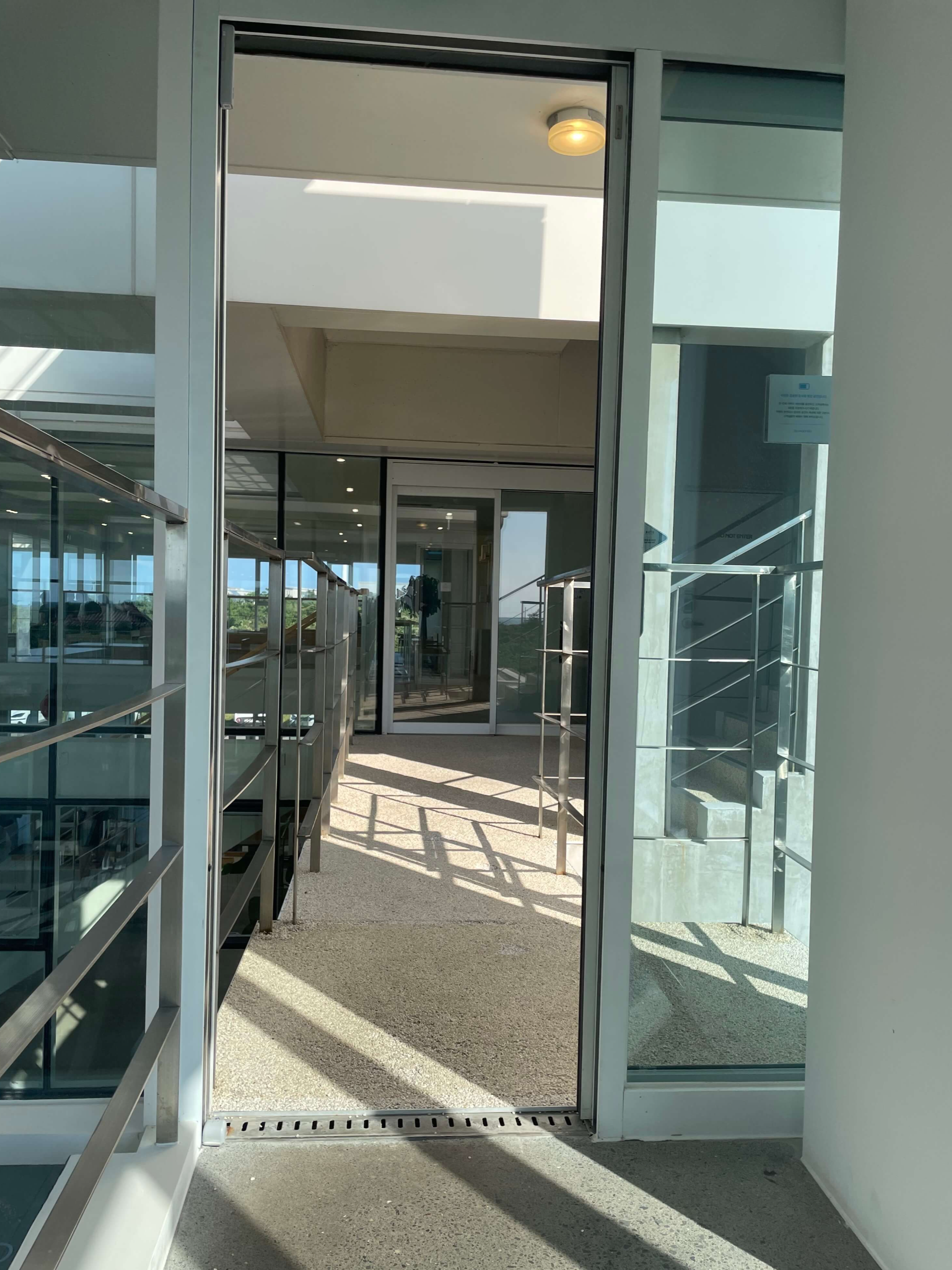 외부 로비는 두 개의 건물을 잇는 가운데 통로 바로 앞에 있습니다.