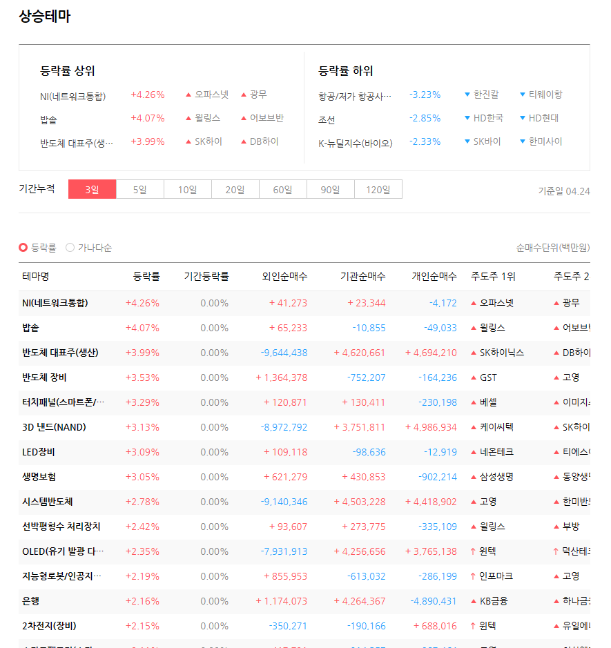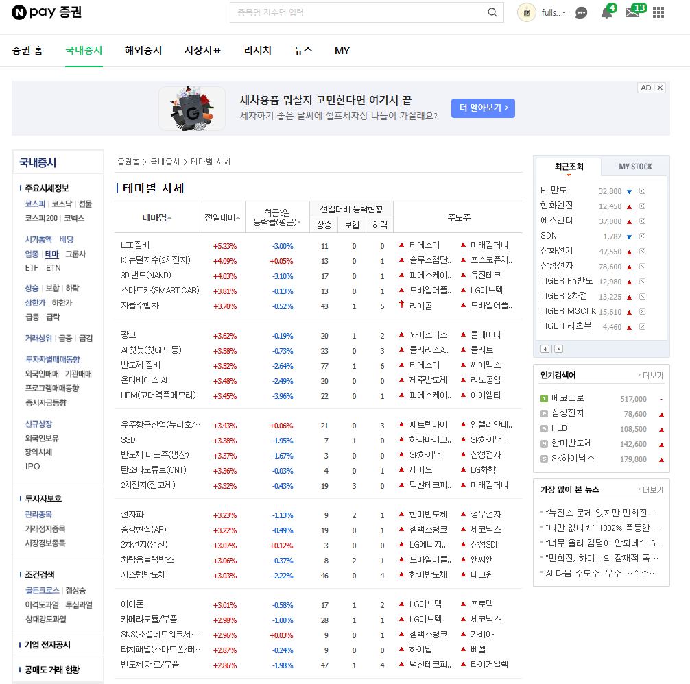 이렇게 하면 테마별로 종목, 등락률, 주도주 등을 확인할 수 있습니다. (간단하쥬?)