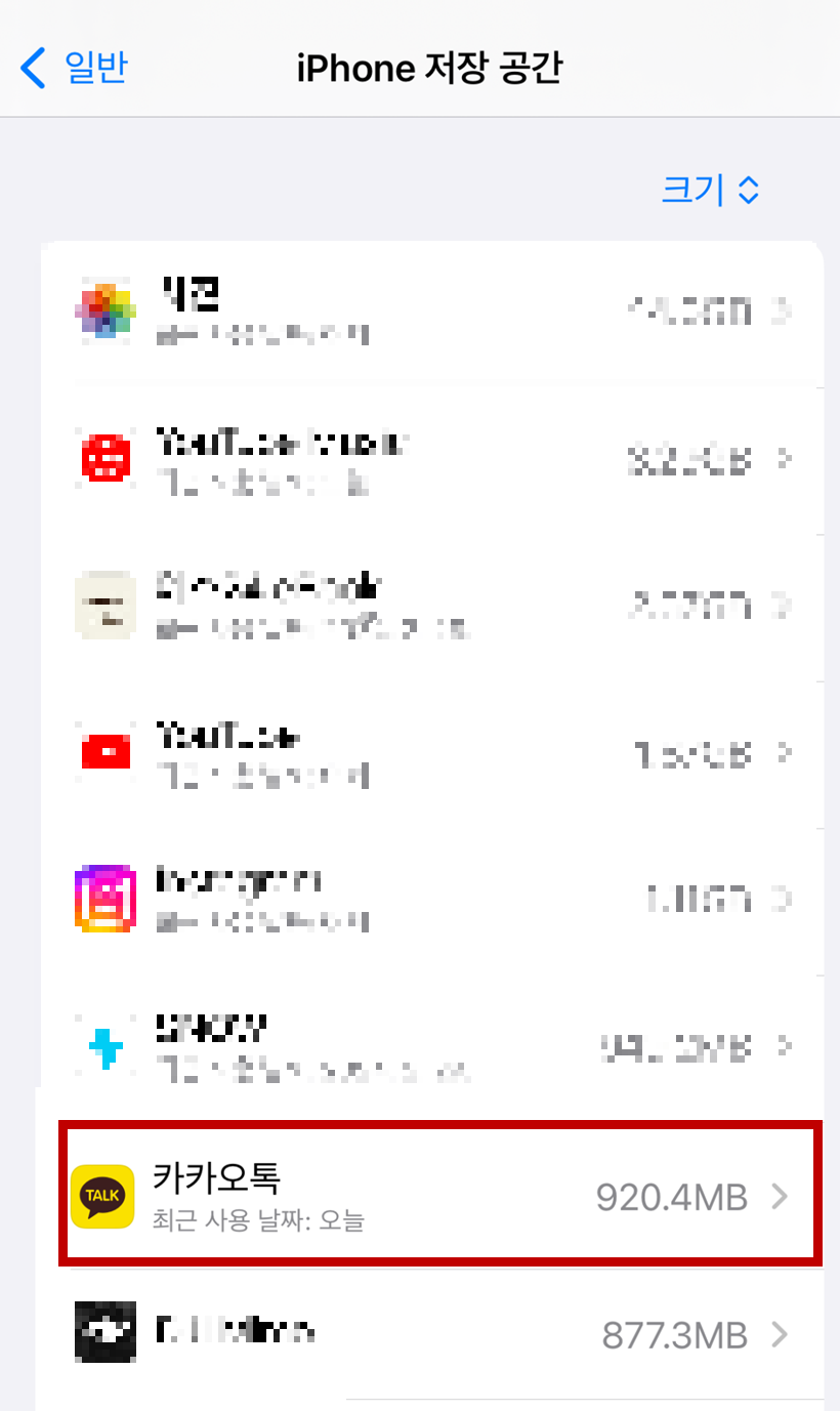 아이폰 저장공간에 들어가면 말도 안 되게 저장공간을 차지하고 있는 '카카오톡'을 볼 수 있습니다.