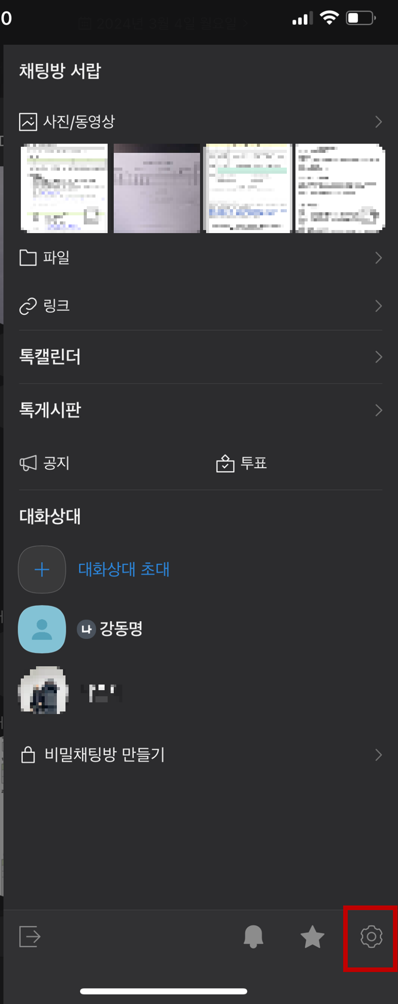 1. 채팅방 우측상단에서 '줄 세 개(채팅방 서랍)'을 클릭합니다.