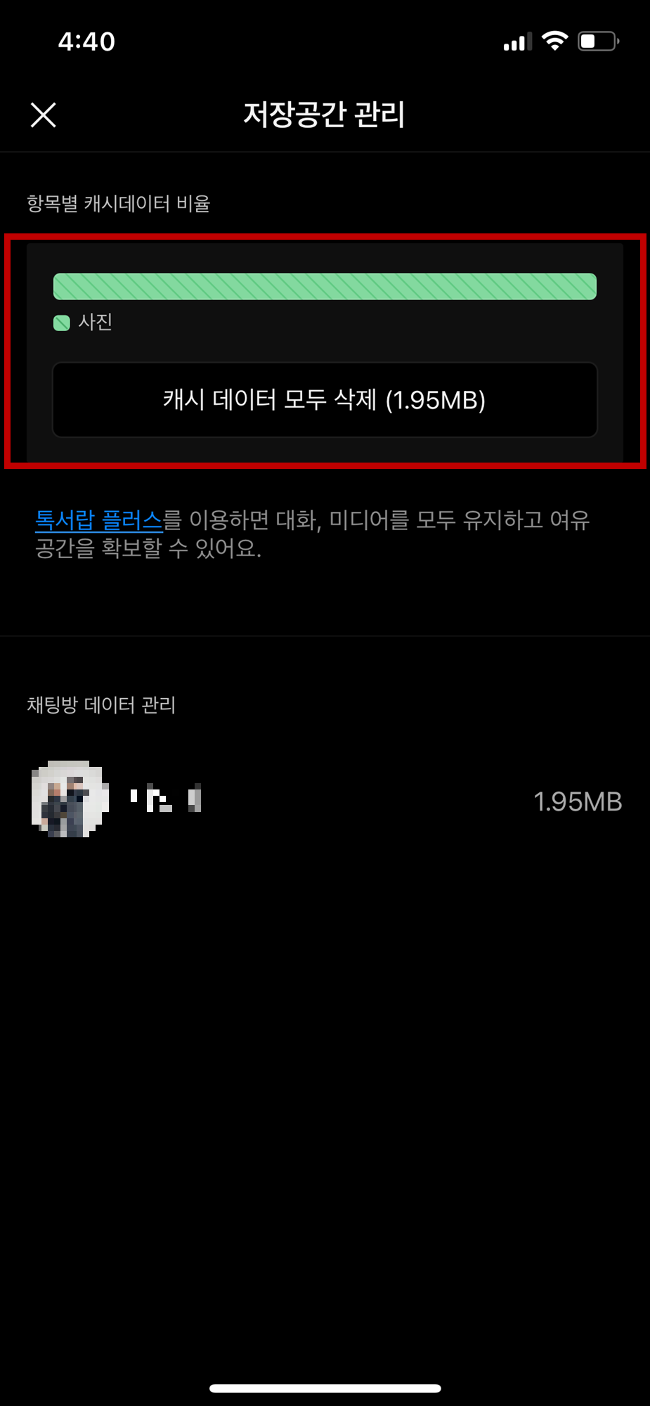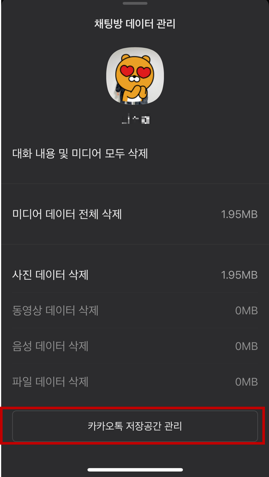 ※ 만약 채팅방 안에 있는 저장공간만 관리하고 싶을 경우 바로 위 그림에서 '미디어 데이터 전체 삭제'를 누르면 해당 채팅방 안에 있는 데이터만 삭제됩니다. 참고하세요^^