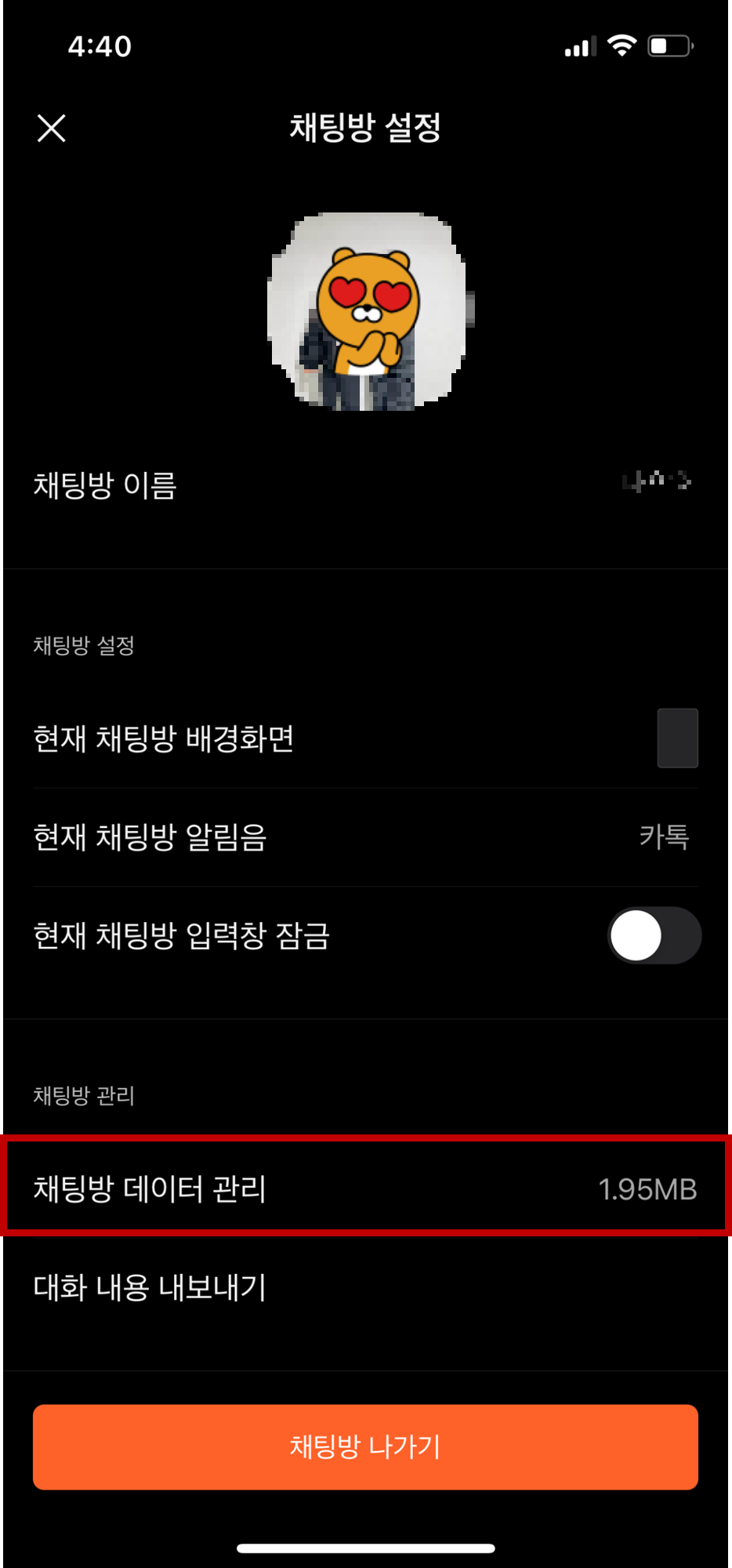 3. '채팅방 데이터 관리'를 클릭합니다.