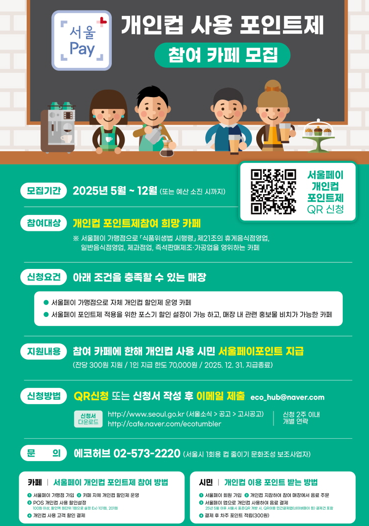 ‘텀블러데이’에는 개인 컵 사용 시 음료 한 잔당 최대 2,500원 할인(매장당 최대 50잔)을 제공하며, 할인된 금액은 서울시가 해당 매장에 정산합니다. ‘서울페이 개인 컵 포인트제’에 참여를 희망하는 매장은 공고문과 포스터의 QR코드를 통해 신청서를 제출하거나, 서울시 보조사업자의 전자우편(eco_hub@naver.com)으로 신청서와 사업자등록증을 제출하면 됩니다. 공고문은 서울시 누리집과 서울시 보조사업자 온라인 카페에서 확인할 수 있습니다.