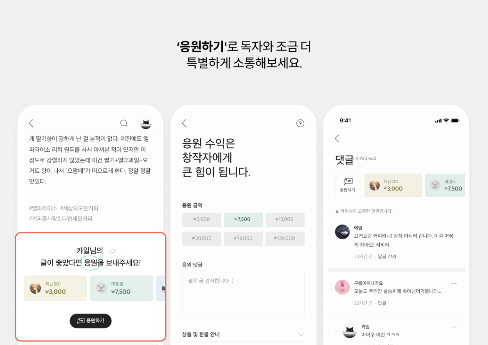 - 표시: 응원금과 응원 메시지는 댓글 영역에 강조되어 표시